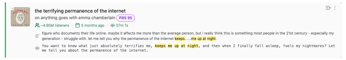- Advanced Search: Searching across millions of podcast transcripts for specific keywords or phrases